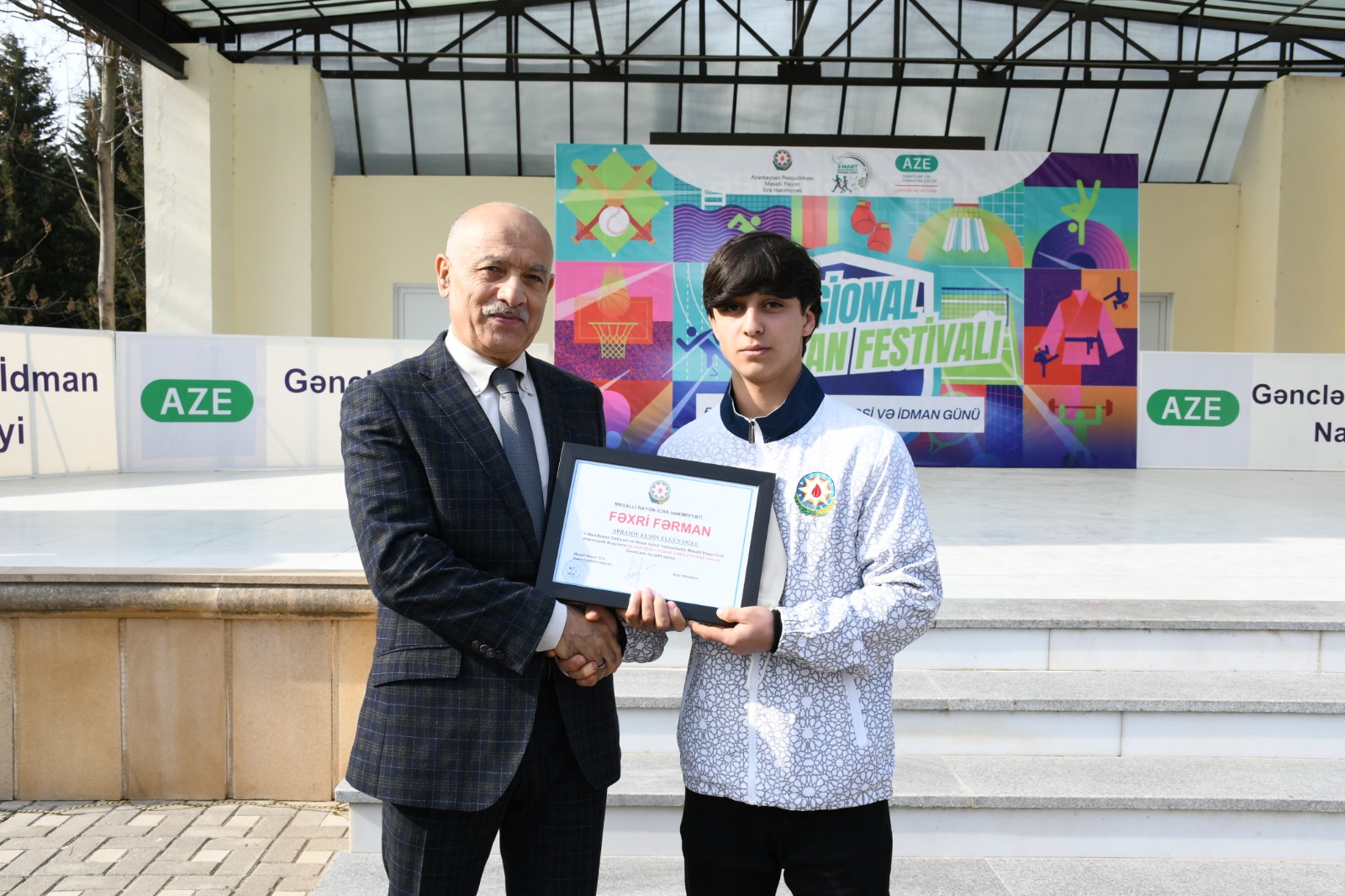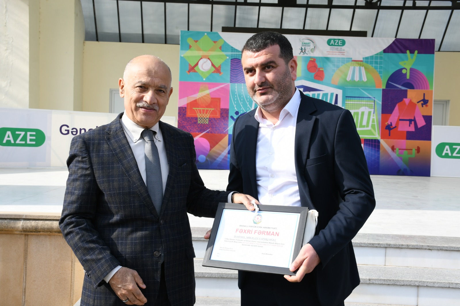 Rəsmi hissənin sonunda rayonun idman sahəsində səmərəli fəaliyyəti, sağlam həyat tərzinin təbliği, yüksək idman nailiyyətlərinin əldə olunmasına mühüm töhvə verməsinə görə İcra Hakimiyyəti Başçısının müvafiq Sərəncamı ilə təltif olunmuş bir qrup məşqçi-müəllim və idmançıya rayon rəhbəri Araz Əhmədov tərəfindən Fəxri Fərman təqdim edildi.