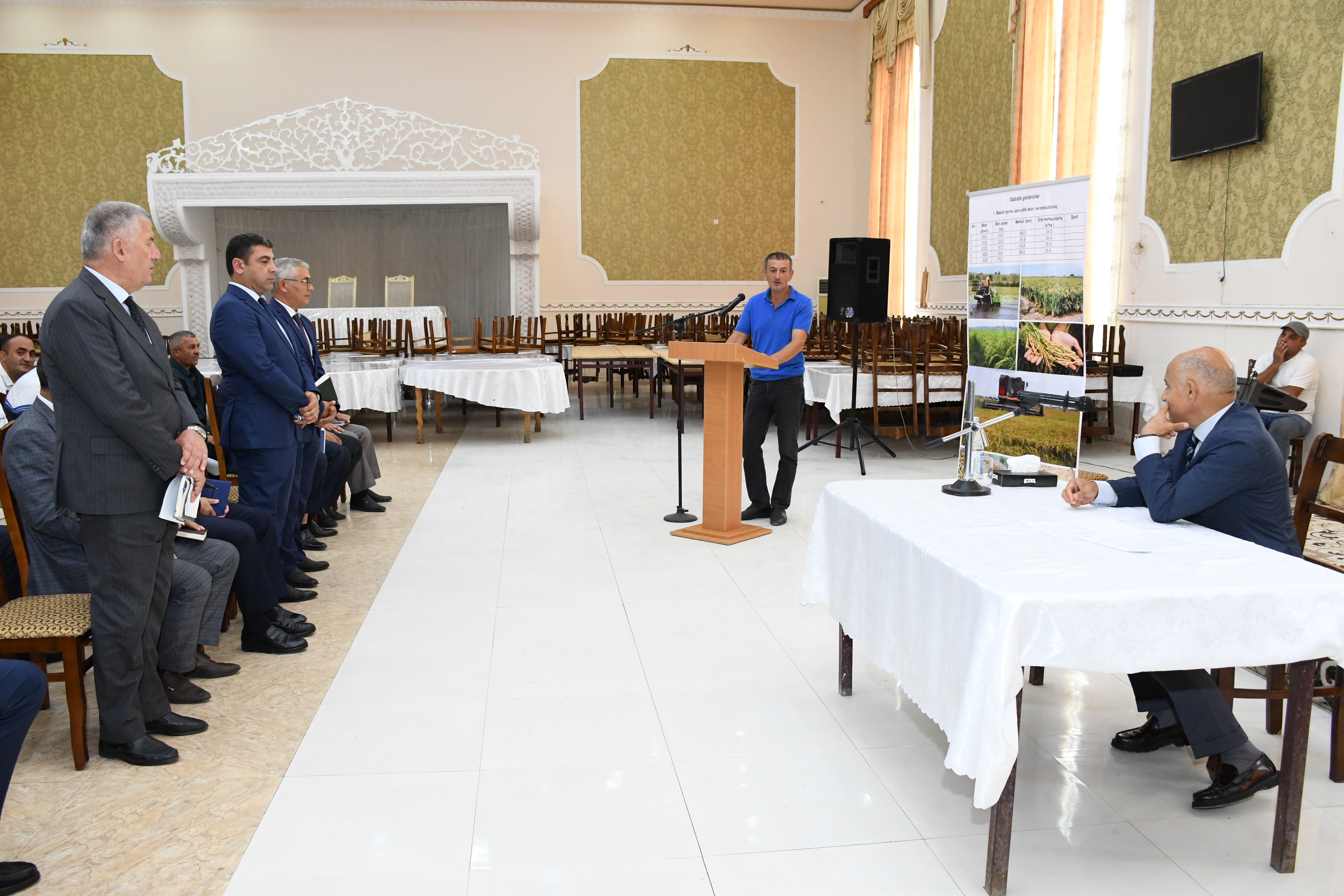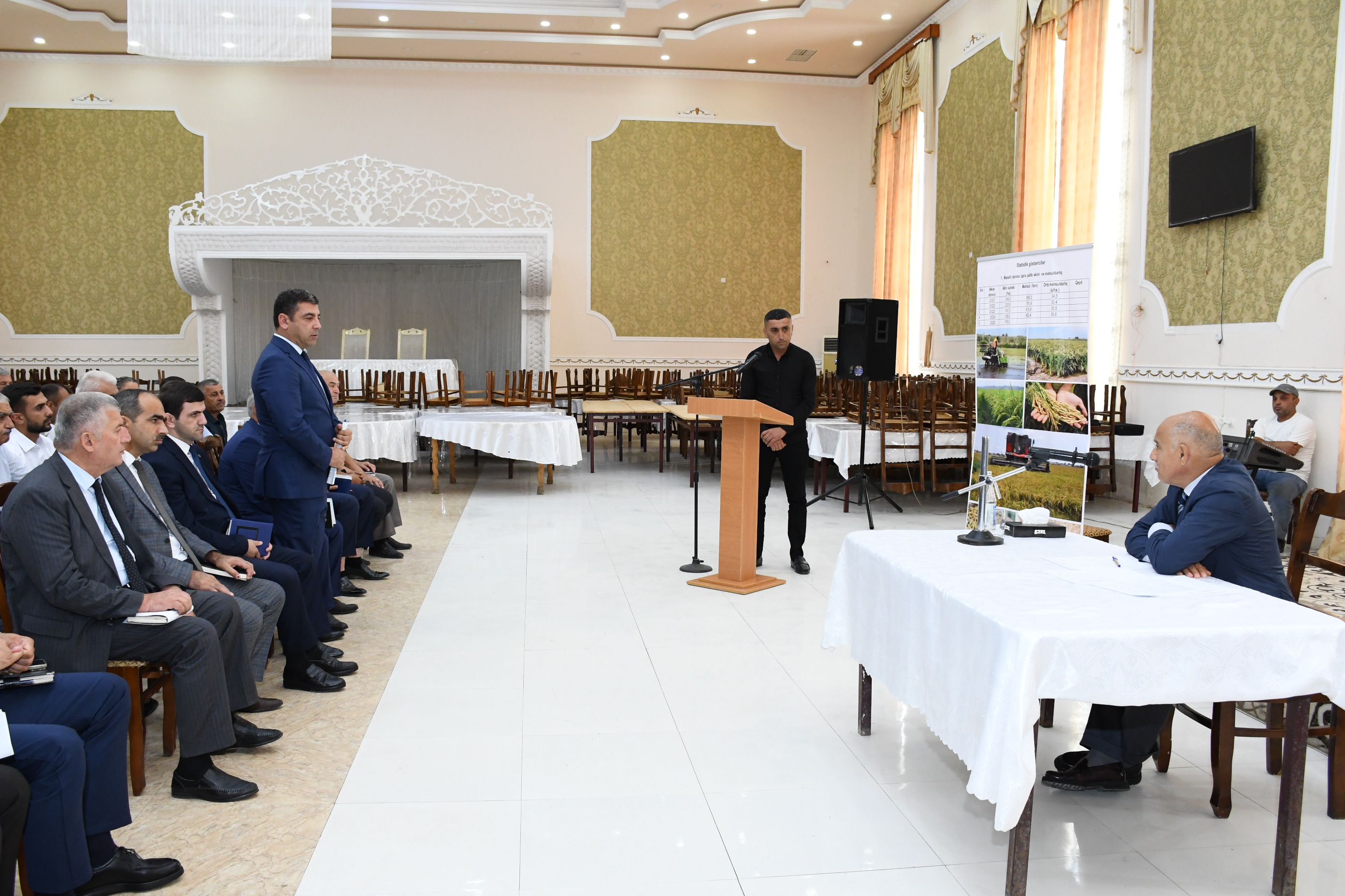 Müşavirədən əvvəl rayon rəhbəri kənd təsərrüfatı məhsullarından hazırlanmış güşəyə baxış keçirmişdir.
